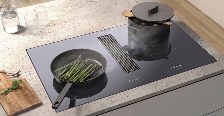 Zurückhaltendes Design kombiniert mit einem komfortablen Bedienkonzept: Jede Kochzone wird intuitiv über einen eigenen Slider gesteuert. Der integrierte Abzug lässt sich präzise regulieren und überzeugt durch aussergewöhnliche Effizienz. Die praktischen Flexzonen auf beiden Seiten eröffnen zusätzliche Möglichkeiten und sind ideal fürs Kochen mit Bräter oder Grillplatte. Die kompakte Bauart des Lüfters ermöglicht zusätzlichen Stauraum, ideal für eine praktische Schublade, in der Kochutensilien griffbereit verstaut werden können.