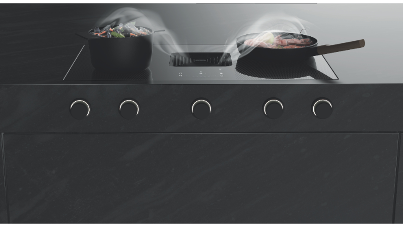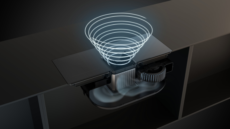 Über klare Gestaltung und durchdachte Nutzerführung. Die vollflächige Bedruckung der Kochzonen schafft Ruhe im Bild und schützt die Oberfläche. Die Bedienlogik wurde neu gedacht - Primärfunktionen im Fokus, alles andere tritt zurück. Und der neue Ansaugbereich bringt Technik und Design zusammen: Die Lamellen zitieren das vertraute Motiv der vorherigen Downline und ermöglichen zugleich eine leistungsstarke, zyklonartige Wrasenerfassung.