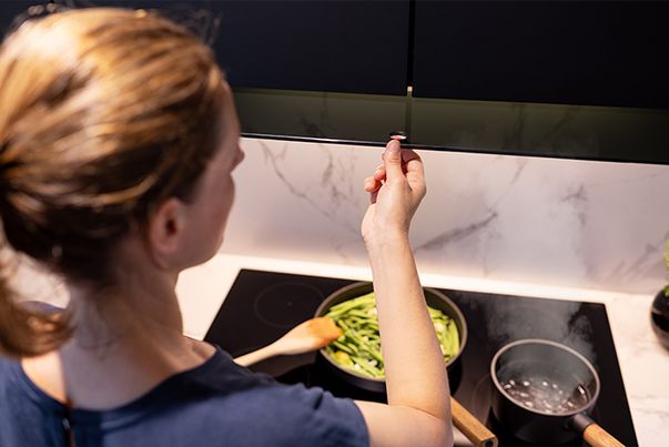 Der Abklappmechanismus der Einbauhaube macht das Pflegen und Reinigen besonders komfortabel. Einfach den Haubenschirm herunterklappen, auswischen und den Fettfilter im Geschirrspüler reinigen. So startet der Dunstabzug automatisch, wenn der Auszug rausgezogen wird und schaltet sich auch umgekehrt wieder aus, wenn dieser zurückgeschoben wird. Wenn eine höhere Abzugsleistung benötigt wird, kann über das Ziehen des Auszugs die Leistung bequem erhöht werden. Ausserdem lässt sich die Farbtemperatur der LED-Leuchten individuell einstellen und so an der Stimmung im Raum anpassen.