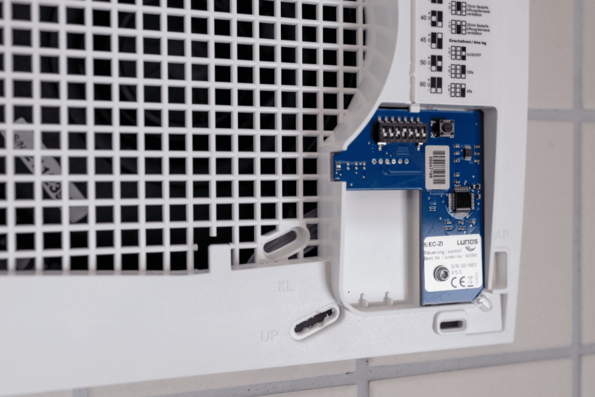Je nach Raumbedürfnis wird die passende Steuerplatine ausgewählt. Alle Steuerplatinen funktionieren nach dem Plug-and-Play-Prinzip und sind steckbar: Durch die Integration im Filterrahmen kann die Blende abgenommen und die Platine neu konfiguriert oder ausgewechselt werden.