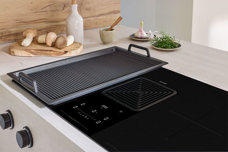 Zurückhaltendes Design kombiniert mit einem komfortablen Bedienkonzept: Jede Kochzone wird intuitiv über einen eigenen Slider gesteuert. Der integrierte Abzug lässt sich präzise regulieren und überzeugt durch aussergewöhnliche Effizienz. Die praktischen Flexzonen auf beiden Seiten eröffnen zusätzliche Möglichkeiten und sind ideal fürs Kochen mit Bräter oder Grillplatte. Die kompakte Bauart des Lüfters ermöglicht zusätzlichen Stauraum, ideal für eine praktische Schublade, in der Kochutensilien griffbereit verstaut werden können.